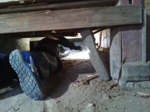 ARC.では、床のきしみや沈み、空洞音をしっかりチェック!!!その後、床下に潜り徹底的調査を開始いたします。大変狭い床下ですが、限界突破しながら潜って潜ってお客様が快適に過ごせるようしっかり施行いたします。