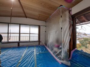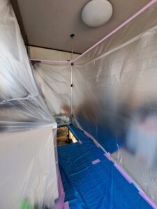 屋根裏の埃が落ちても良いように周りをカバーしてから作業に入ります。