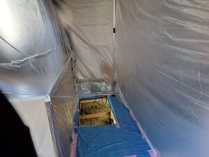 歩けば体中のカビと砂などが舞うため、外へと続く道のりには養生が必須です。